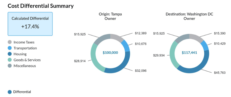Costs vary widely around the country. Below is an example illustration of a candidate. They have a family size of four, own a home in Tampa and are considering a job assignment in Washington, D.C. This prospective employee is estimated to experience a more than 17 percent increase in their overall living costs by accepting a job in D.C.